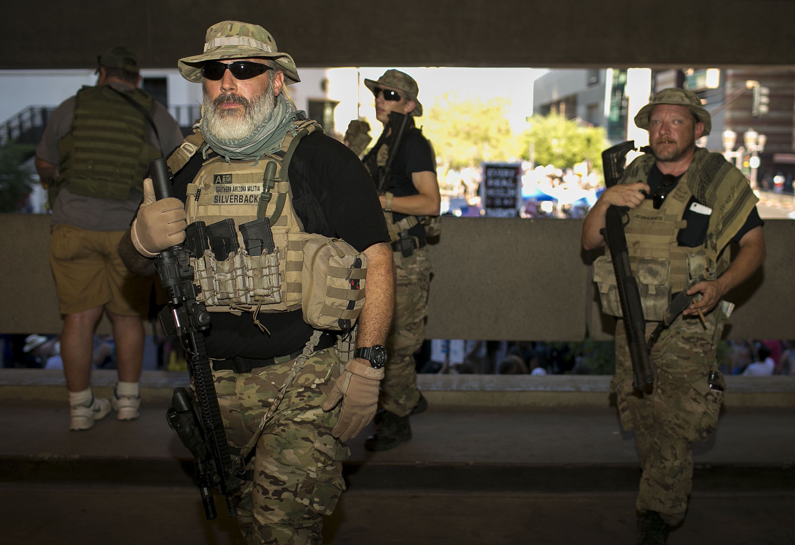 PHOENIX, AZ – AUGUST 22, 2017: Members of the Southern Arizona Militia patrol a parking structure across from the Phoenix Convention Center on Tuesday. The members, who declined to provide their names, said they are non-partisan and chose to attend the rally to protect citizens. President Trump drew criticism for scheduling the rally just a week after racially charged violence broke out in Charlottesville, Va. CREDIT: Reilly Kneedler for The New York Times.