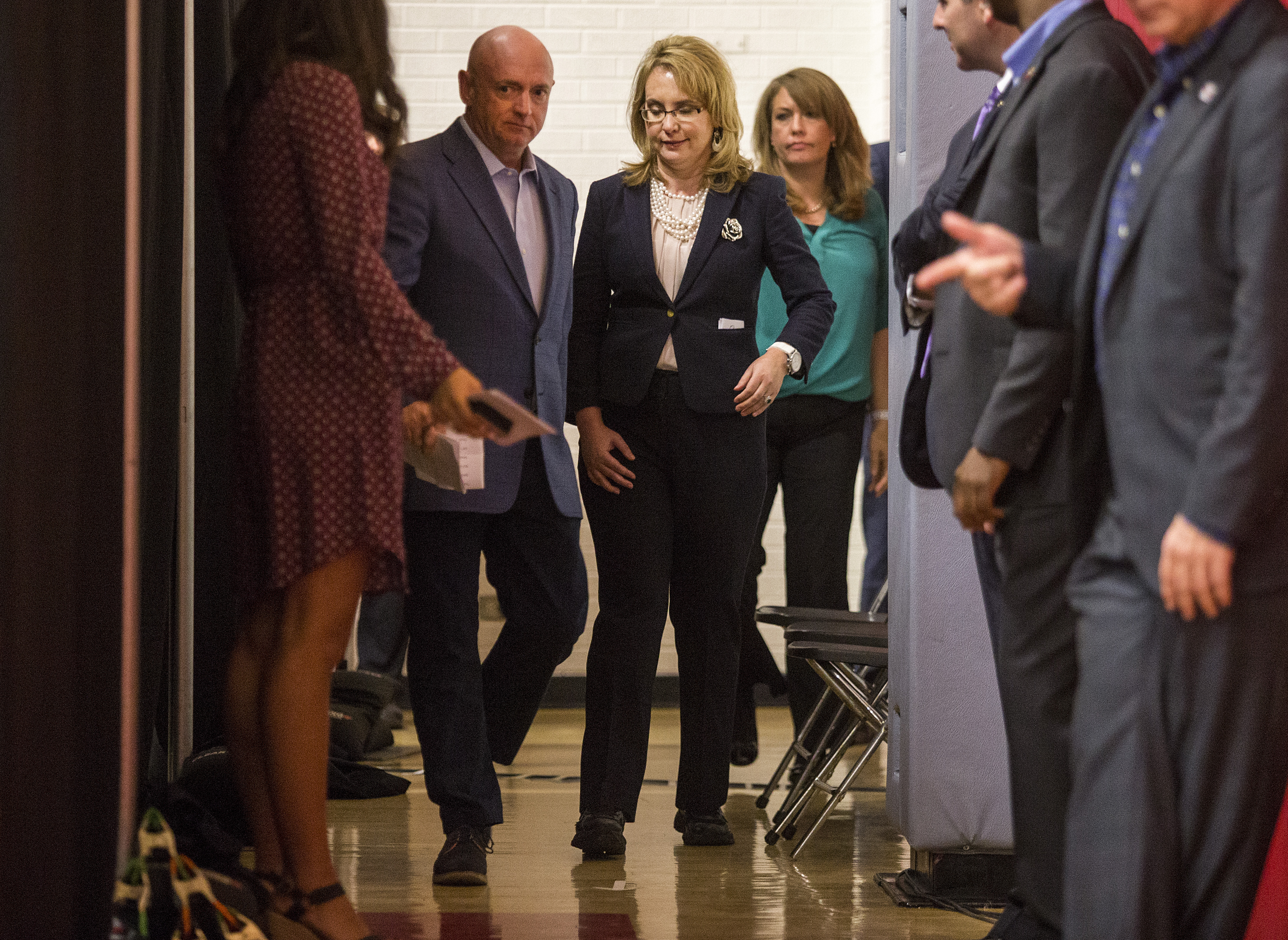 Mark Kelly and Gabrielle Giffords make their way up to the podium during a campaign stop for Democratic presidential candidate Hillary Clinton, at Central High School in Phoenix, Arizona, on Sunday, March 20, 2016.