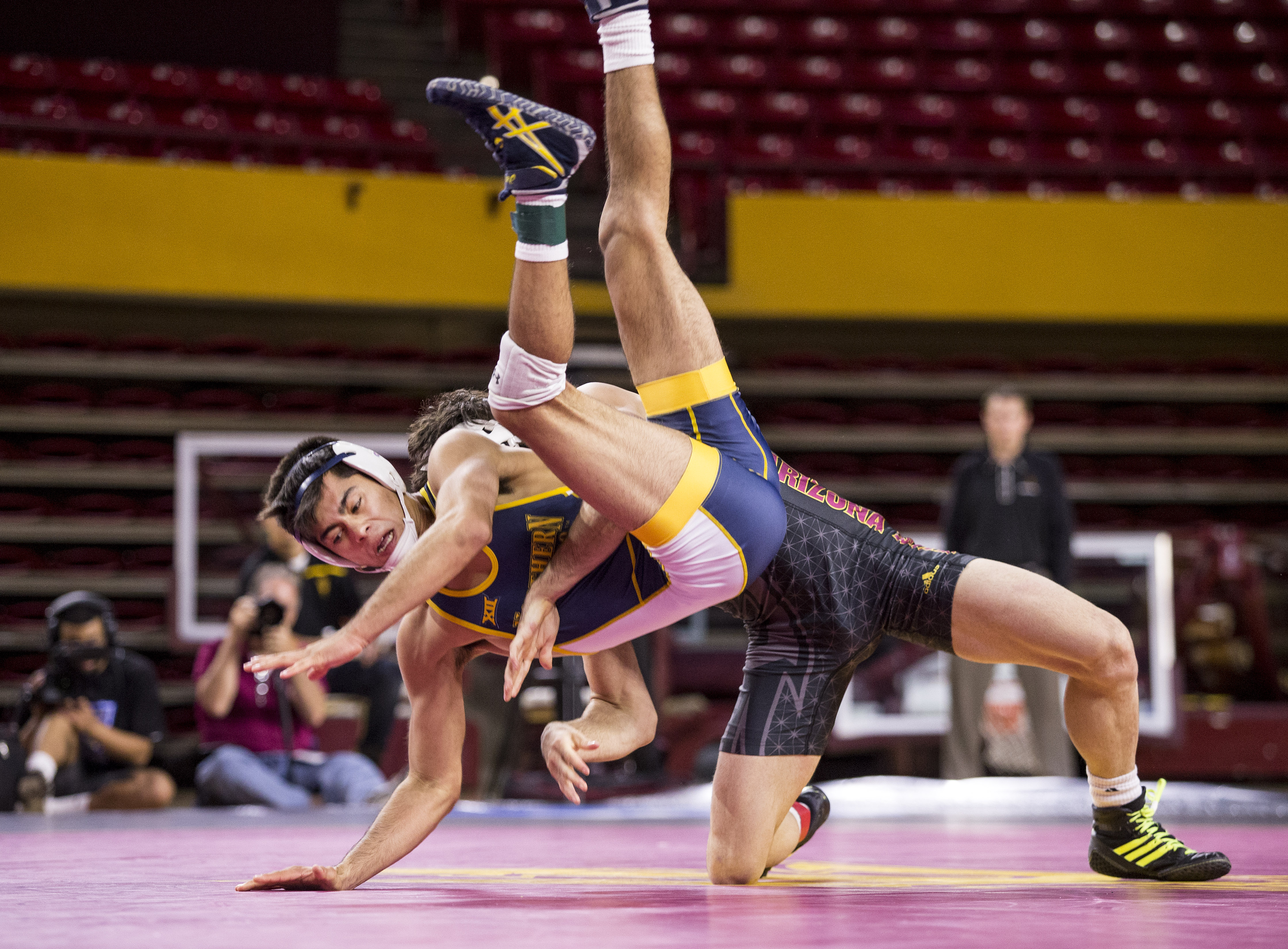 ASU’s Robbie Mathers, right, takes down UNC’s Sonny Espinoza in a 141-pound matchup during a meet against the University of Northern Colorado at Wells Fargo Arena in Tempe, Ariz., on Thursday, Nov. 12, 2015. The ASU Sun Devils took down the UNC Bears 21-14.