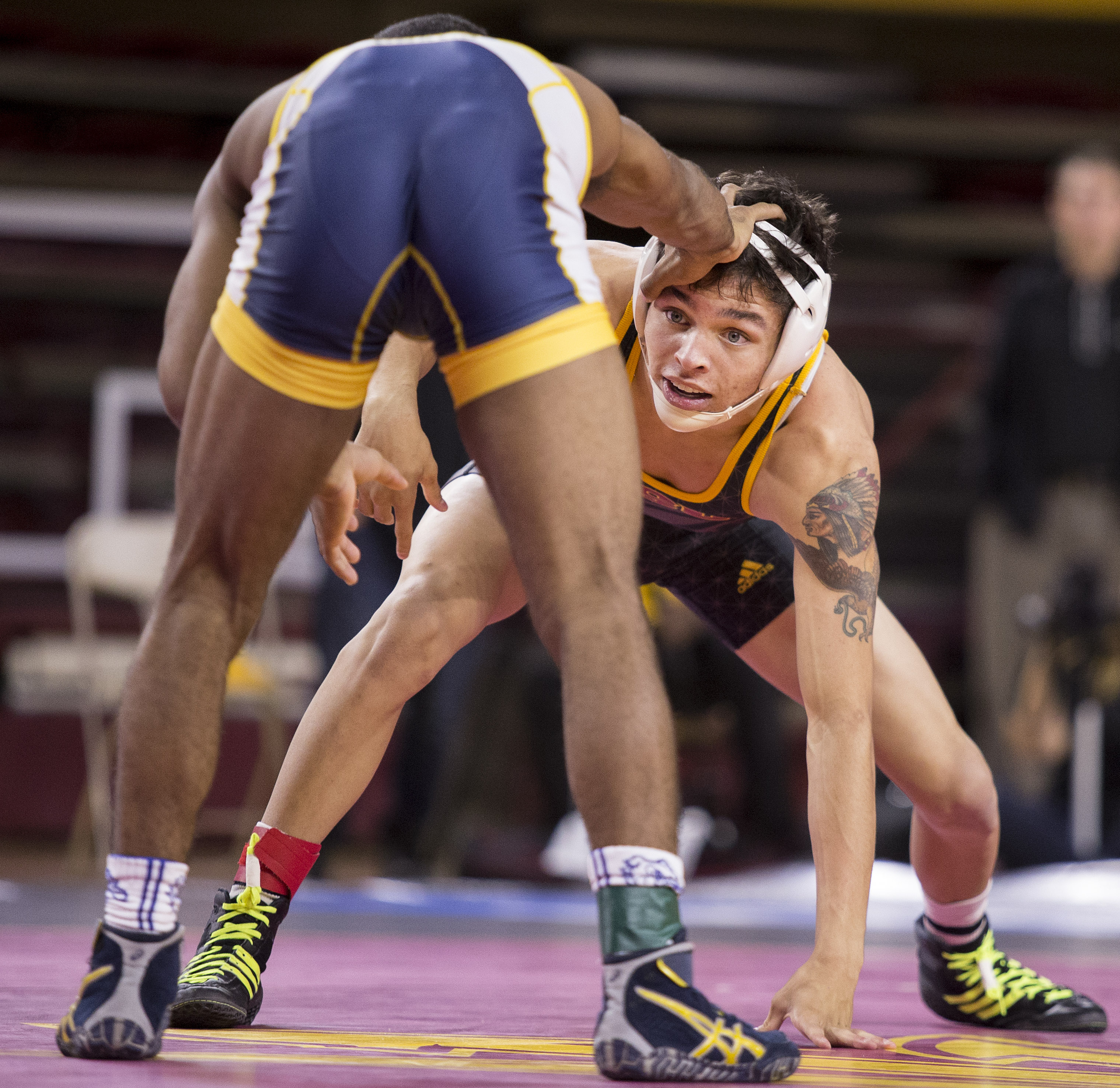 ASU’s Mikel Perales, right, eyes up opponent Trey Andrews in a 125-pound matchup during a meet against the University of Northern Colorado at Wells Fargo Arena in Tempe, Ariz., on Thursday, Nov. 12, 2015. The ASU Sun Devils took down the UNC Bears 21-14.