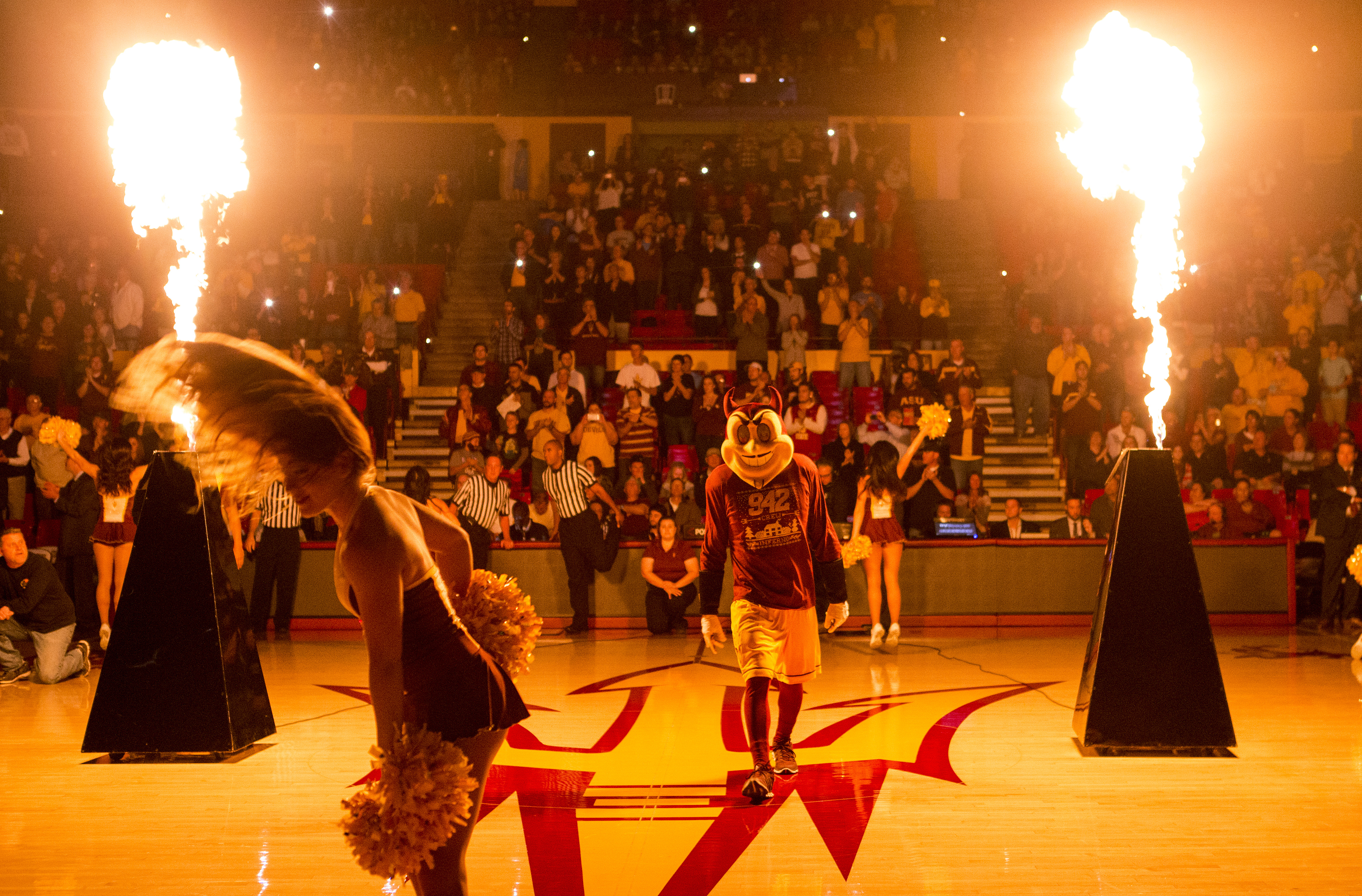 Previous Image Next Image 120515 Fire2 The Arizona State University mascot “Sparky” helps lead the Sun Devil cheerleaders before a basketball game.